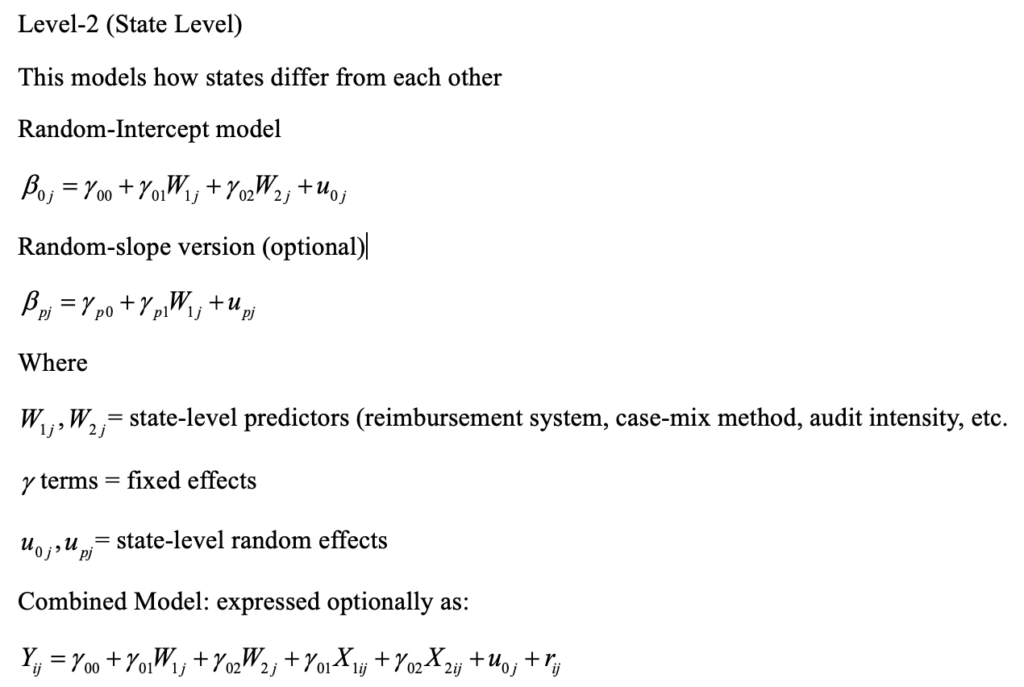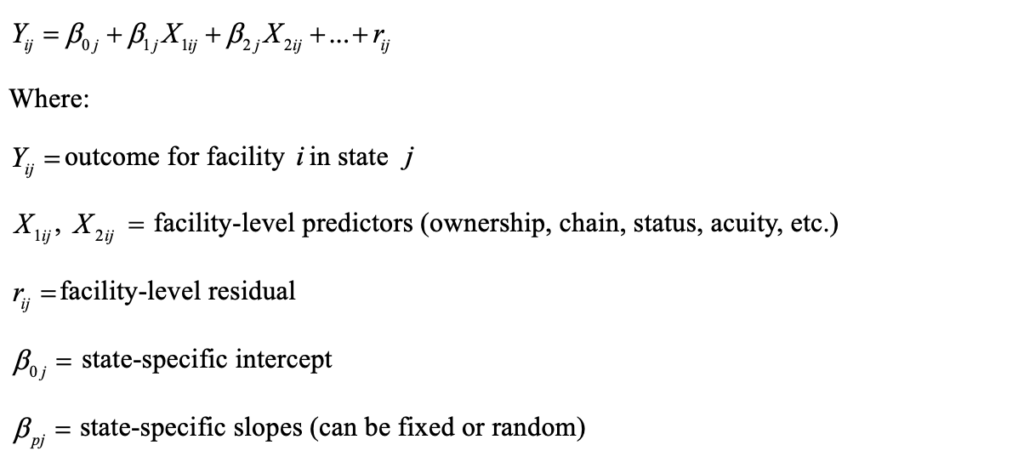 Nursing homes are nested within states. Every state’s nursing home policy, culture, and demographics is unique. For instance, Kansas has 275 facilities with an average of 60 beds. California’s 1200 facilities average 110 beds. The intercept and regression line would be unique for each state. Therefore, a model that accounts for the variance in state intercepts and trend lines is necessary.[