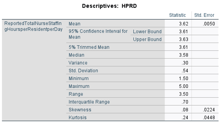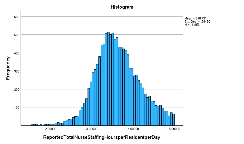 ASPE researchers for some unexplained reason categorized equal interval/ratio level measures. They presented no evidence that such a transformation is necessary. In fact, variables such HPRD, bed size are normally distributed and in accord with regression assumptions. For instance, Table 7 and the histogram in Figure 2, indicate that HPRD is normally distributed.