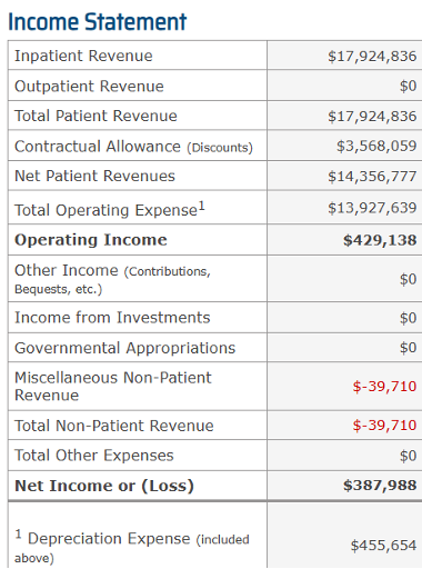 Expenses in Table 1 are shown as $13,927,639 – less than net patient revenue even though these expenses include noncash expenses such as depreciation and interest plus payments to related parties, and the home office. So, a large portion of the noted expenses are tax write downs and transfers to related parties at a questionable cost that enhance cash flow. Even with costs that are non-costs folded into expenses shown on the income statement, the facility had a net operating income of 3%.